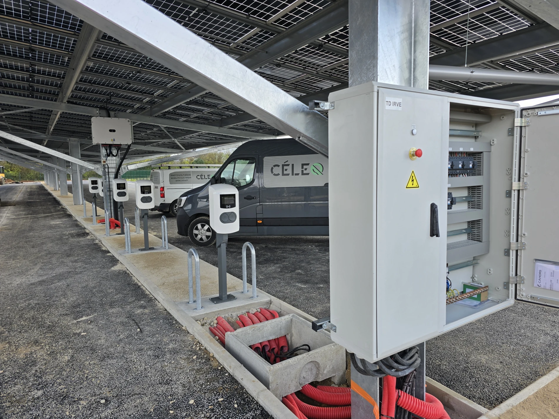 CELEQ a récemment réalisé l’installation de cinq bornes de recharge doubles pour véhicules électriques à Saint-Vulbas (01), implantées sous une ombrière photovoltaïque. Cette solution innovante permet de combiner production d’énergie renouvelable et infrastructure de recharge, tout en offrant une protection efficace des véhicules et des équipements contre les intempéries.